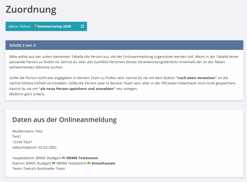 Die Daten, die ein Aktionsteilnehmer in der Onlineanmeldung eingegeben hat, müssen nun einer Person im RRCenter zugeordnet oder es muss ein neuer Personendatensatz gespeichert werden.