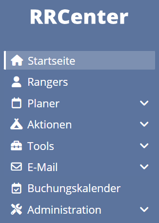 Die verschiedenen Module des RRCenters werden über die Registerkarten angewählt. Manche Module enthalten Unter-Menus - diese sind durch den kleinen Pfeil am rechten Rand gekennzeichnet. Eventuell werden dir – je nach deiner persönlichen Berechtigung im RRCenter – nicht alle der hier aufgeführten Module angezeigt.